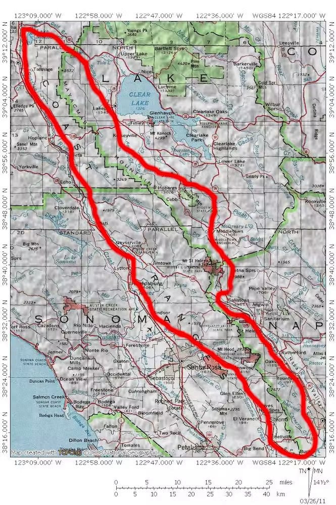 The Mayacmas Mountains are located south of the Mendocino Range, west of Clear Lake, and east of Ukiah in Mendocino and Lake Counties, and extend south into Napa and Sonoma Counties. The range stretches for 52 mi in a northwest-southeasterly direction.